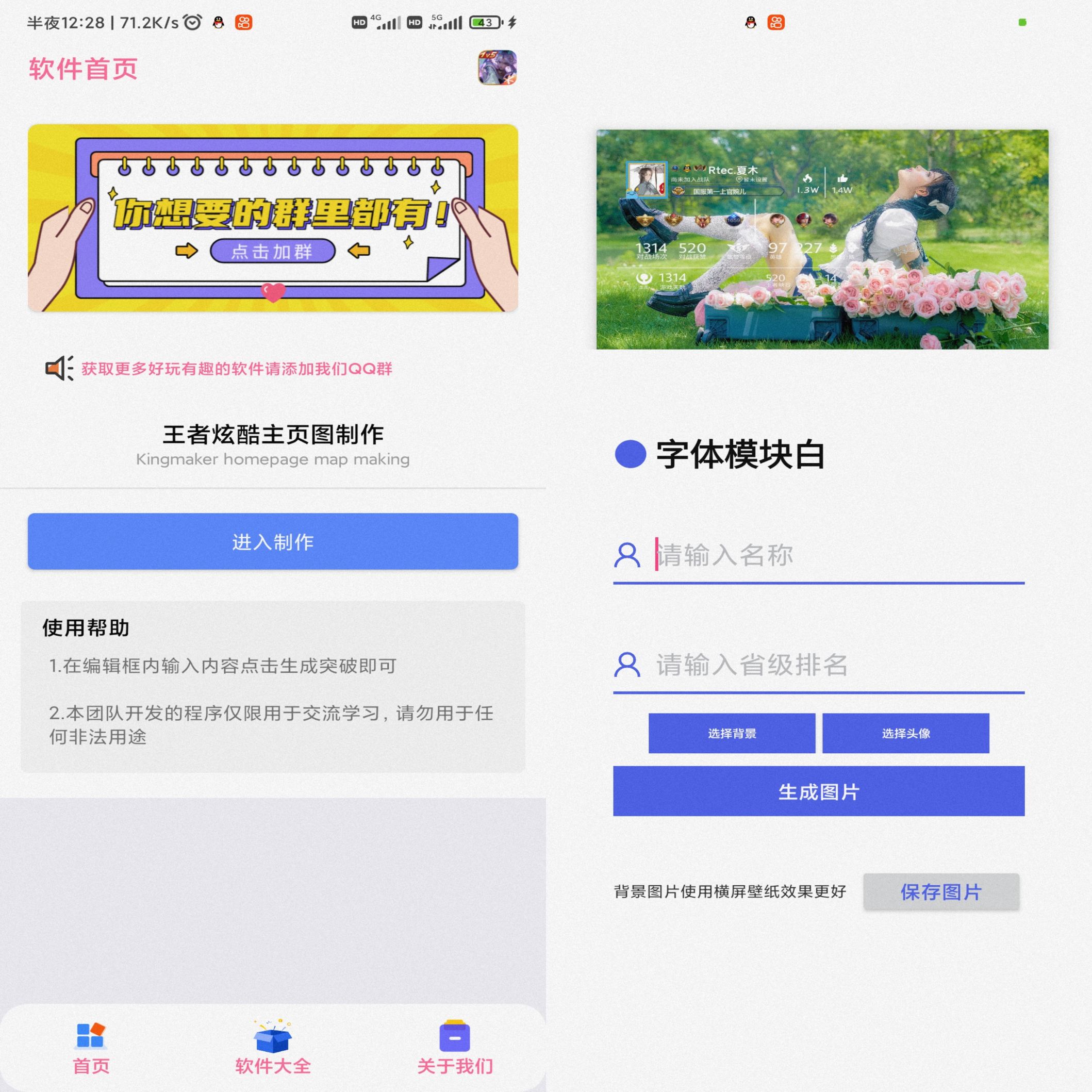 一款王者主页p图工具,软件支持自定义选择图片,一键生成超级好看的小姐姐王者荣耀炫酷主页背景图,可以用来发朋友圈或者发短视频装13
