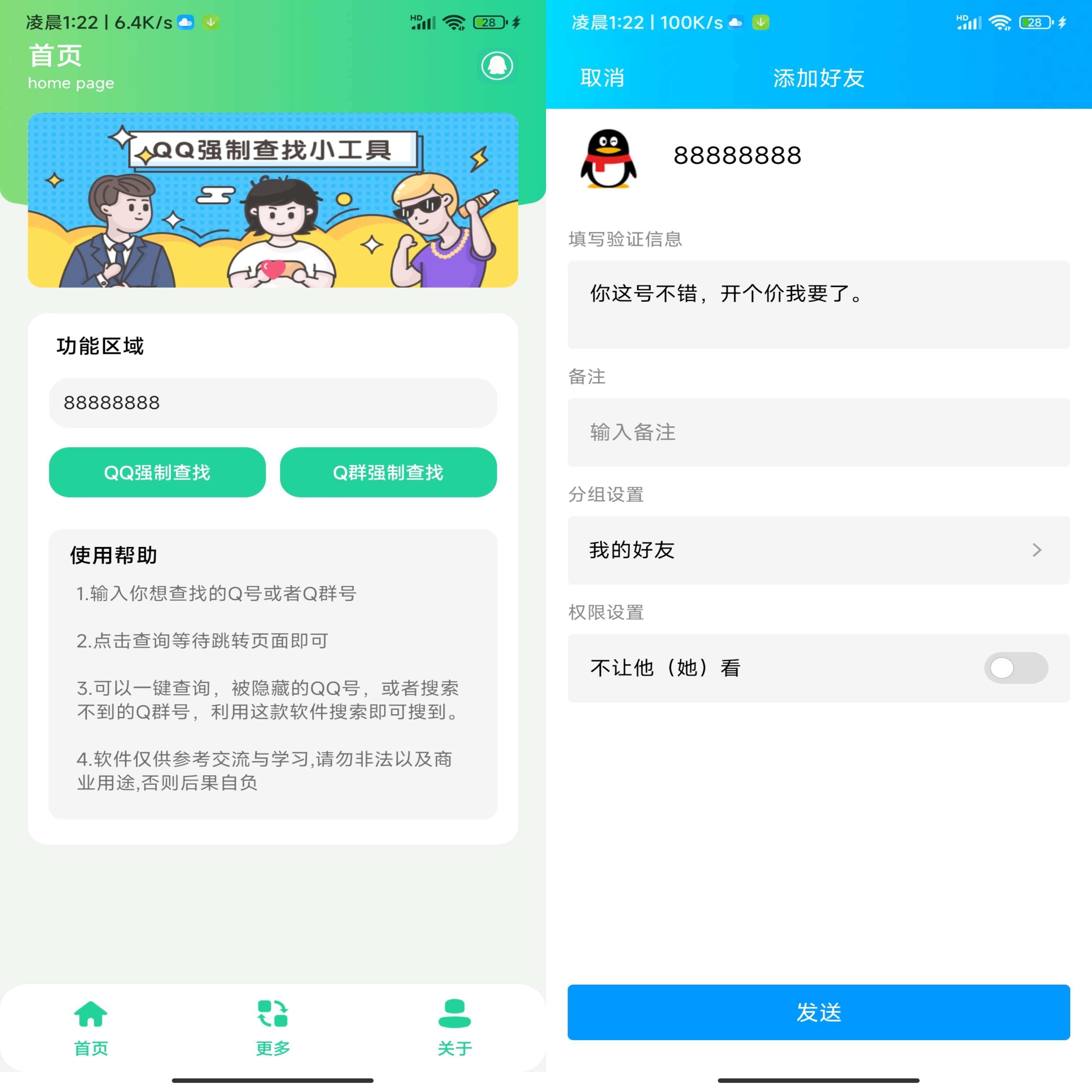 一款QQ查询小工具,可以通过输入QQ号和群号来查找隐藏QQ和Q群的软件,QQ里搜不到的别人和群,直接打开这款软件搜索即可搜到!