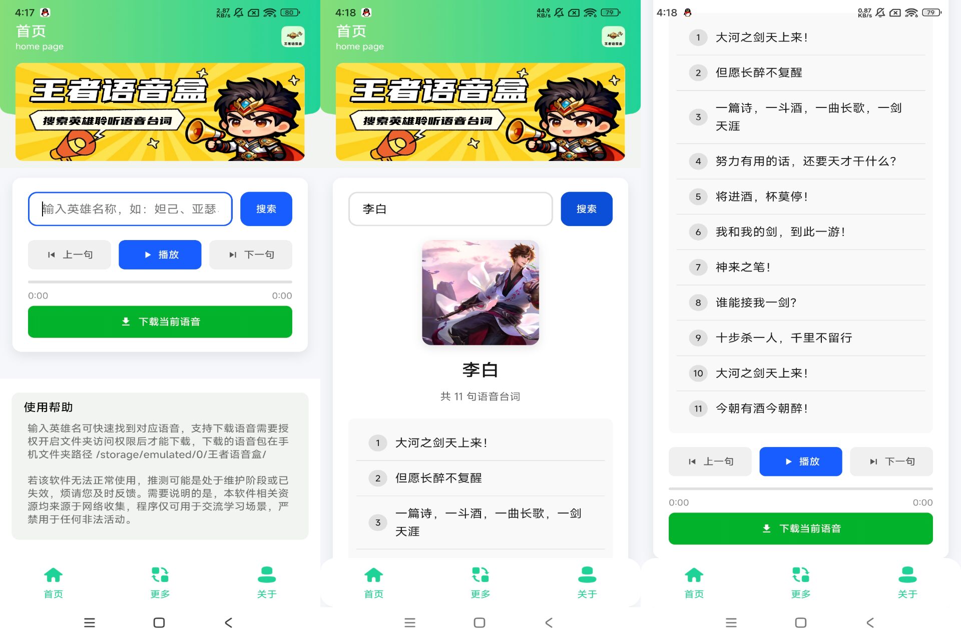 一款王者语音盒App,游戏语音,乐趣翻倍!提供王者荣耀游戏语音包、语音分享、语音设置等功能,让你在游戏中享受更多乐趣,与队友沟通更便捷。界面简洁,操作便捷,是你的王者荣耀玩家好帮手!