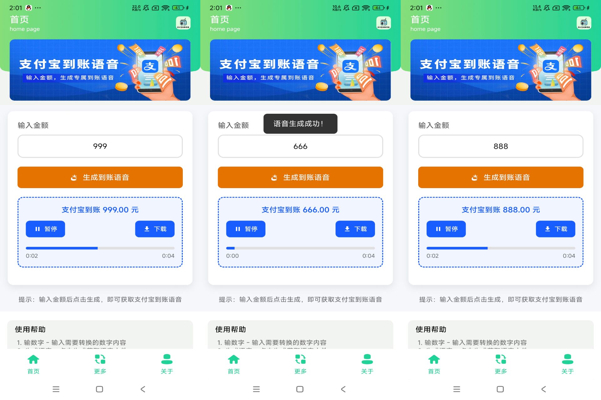 一款支付宝到账语音生成器App,个性提醒,趣味十足!提供自定义支付宝到账语音功能,让你制作专属的收款提示音,增添收款乐趣。界面简洁,操作便捷,是你的整蛊趣好友的好帮手!