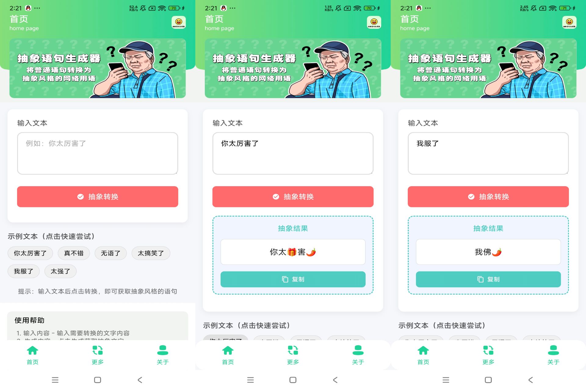 一款网络抽象语句生成器App,网络用语,个性表达!提供基于网络用语的抽象语句生成功能,让你在网络世界中表达独特个性。界面简洁,操作便捷,是你的网络达友好帮手!