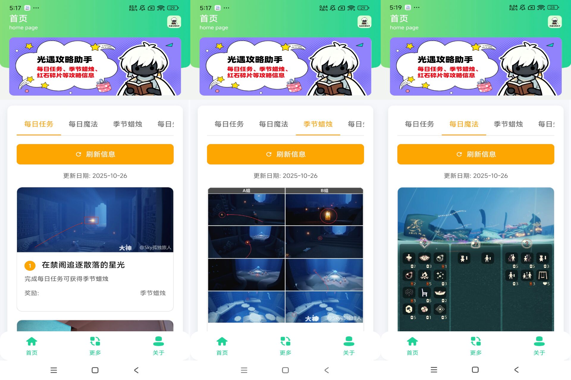 一款光遇攻略助手App,提供每日任务、季节蜡烛、红石碎片等详尽攻略信息。每日任务助你知晓玩法与完成技巧,快速拿到白蜡烛或季节蜡烛;季节蜡烛攻略帮你了解获取地点与时间。界面简洁,操作便捷,是你的光遇玩家好帮手!