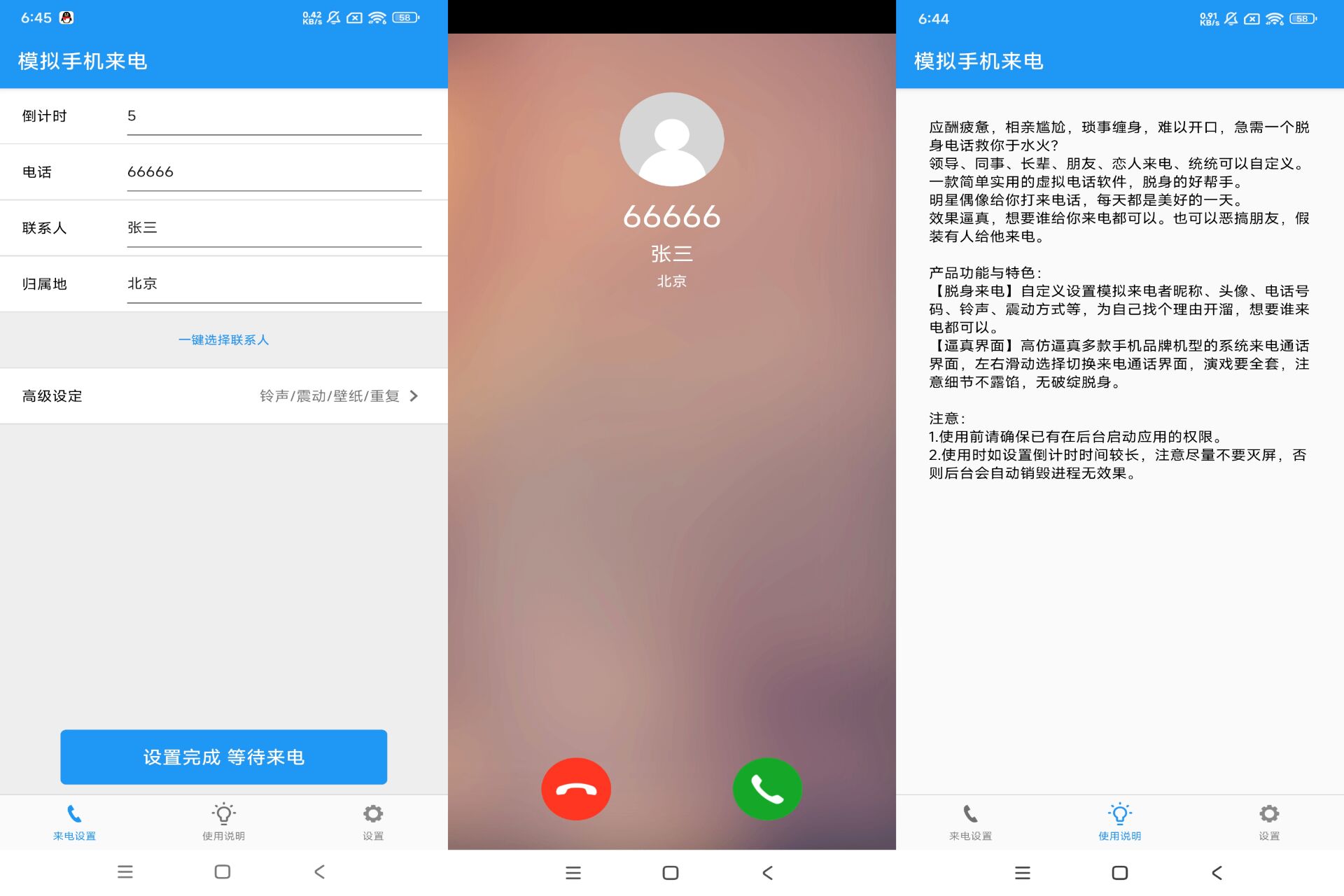 一款模拟手机来电App,趣味恶搞,轻松娱乐!提供模拟来电功能,可以自定义来电人、来电时间、铃声等,让你制造有趣的场景,增添生活乐趣。界面简洁,操作便捷,是你的恶搞娱乐好帮手!(解锁去广告)
