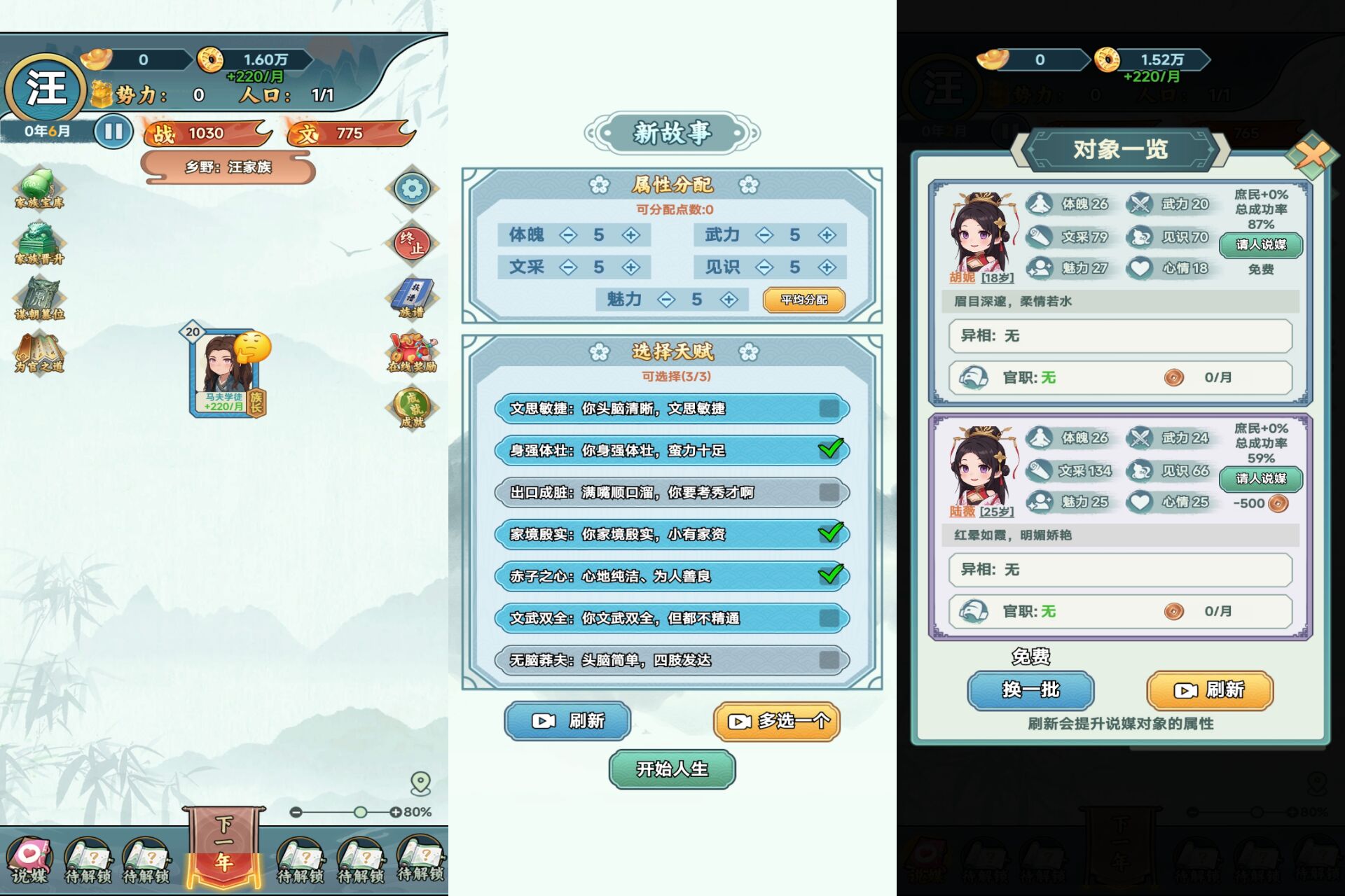 一款手机模拟经营/策略游戏,世代传承,谱写传奇!游戏中,你将扮演家族的掌门人,通过联姻、培养后代、经营产业等方式,让家族不断壮大,并为下一次“重开”积累优势,书写家族的辉煌历史。(解锁免广告获得奖励)